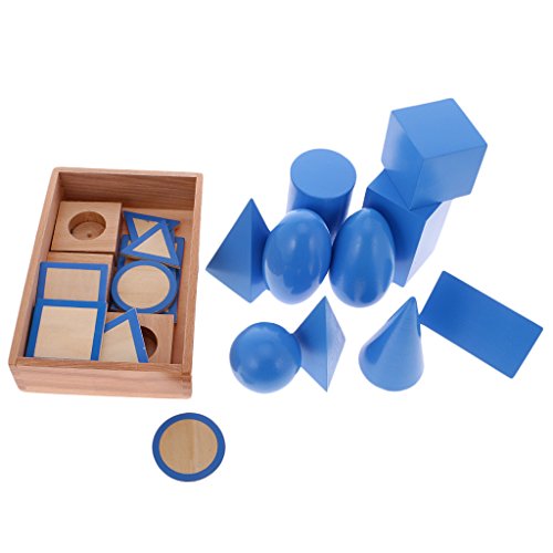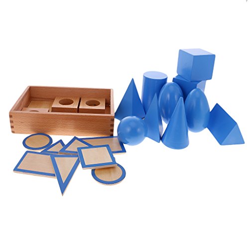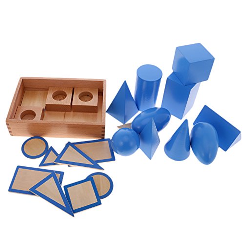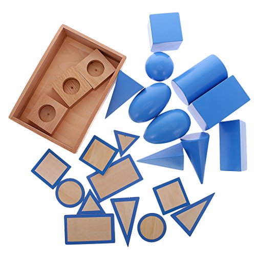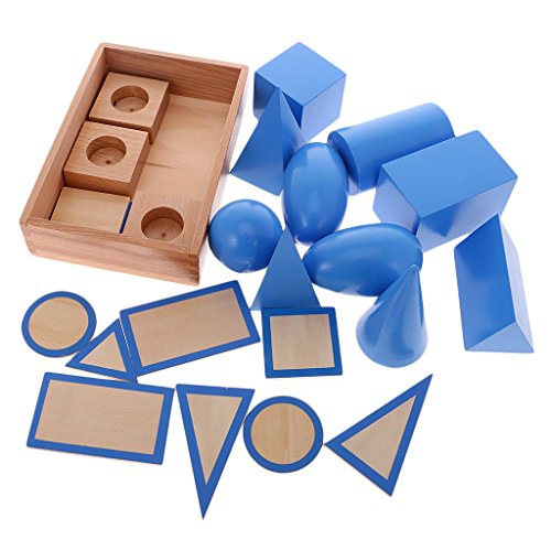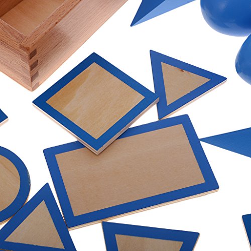 - 立方体、直方体、円柱、円錐、球、楕円体、卵形、三角柱、三角錐、ポッド:10基本的な幾何学的な固形物が含まれています。長方形、正方形、三角形、正三角形と円:5つの基本的な平面形状が含まれていると10木片。球、コーンと卵形を表示するための3ウッドベース。ウッドベースと平面ジオメトリピース木製ボックス