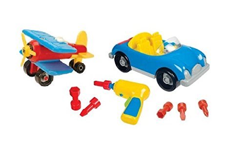 39 total airplane and car parts (colors may vary);One battery powered drill with 6 bits (colors may vary);Big nuts and bolts for easy take-a-part action;Hours of imaginative play for ages 3 and up;Requires 2 AA batteries (not included); Ships in plain box