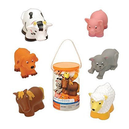 Battat Farm Bath Buddies make bath time fun. This set includes six (6) brightly colored, soft, squeezable bath toys made for fun in the tub. The bath set includes a horse, a cow, a sheep, a cat, a pig and a dog. These bath toys are made with small hands in mind and float on the surface of the water, making them easy to find and grab. These bath buddies come in a reusable plastic storage case to reduce bathroom clutter. Recommended for ages 10 months to 3 years.