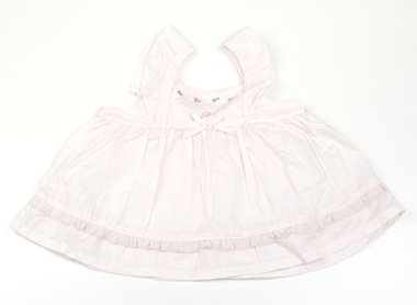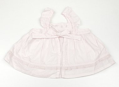 目立ったシミもなく良品です。ストレッチはなくシャツのような素材です。後ろがリボンでエプロンのようなデザインです。サイズ表記がないためフルーサイズかと思われますが、実寸総丈31cmです。