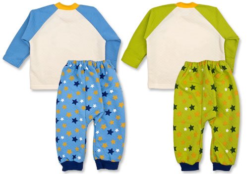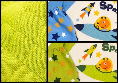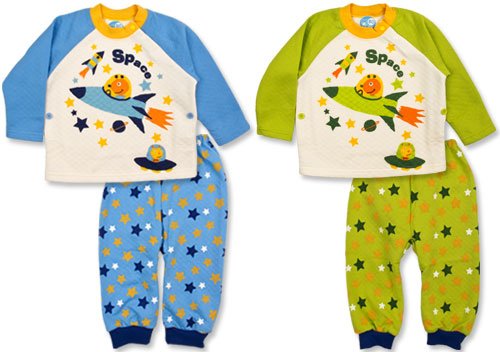 商品説明: ベアボックスから宇宙を飛ぶロケットが楽しいT型長そでパジャマです。 キルティング加工を施した生地で保湿性・吸湿性に優れた生地を使用。 ※キルティング加工とは、2枚の生地の間に綿・ポリエステルを入れて縫い止めた生地のことです。 おなかがでない脇ボタン付き、寝相の悪いベビーちゃんも寝冷えしません。 パンツ裾はゴム入りです。 お星さまの間を宇宙旅行 宇宙人の乗ったUFOとロケットプリントです パンツはカラフルな星柄でとってもCUTE。 お色はブルーとグリーンの2色展開です。 サイズ: 80cm/90cm/95cm カラー: ブルー/グリーン 素材: 本体 ポリエステル70% 綿30% リブ ポリエステル63% 綿32% ポリウレタン5% 原産国: 中国