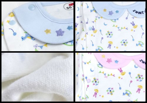商品説明: ベアボックスのメルヘンプリントコンビドレスです 保湿性・伸縮性に優れたスムス綿素材使用。 右肩からおまたのスナップで着脱もラクラク ベビーちゃんの成長に合わせて2通りの着用が可能。 最初はドレスにして足元ゆったり 動きが活発になってきたらおまたのスナップをとめてカバーオールにして足元すっきり 全体に観覧車やティーカップ、メリーゴーランドのお馬さんなどメルヘンキュートなプリント総柄 可愛いフェイク衿には刺しゅう入り お色はサックス、ピンクの2色展開です。 サイズ: 50-60cm カラー: サックス/ピンク 素材: 綿100% 原産国: 中国