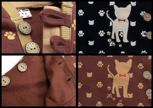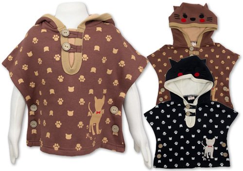 ベアボックスのこれを着るとにゃんこさんに大変身? ねこみみフード付き袖広パーカーです ふわふわの裏起毛でベビーちゃんもあったか 首もとの2つのボタン☆ フード部分にはお顔とお耳がついて超カワ お袖部分が大きく開いているのに重ね着に最適 両サイドに2つのボタンがついているので外してポンチョ風として着用もOK 後ろ身の裾には可愛いシッポプリントも お色はブラックとブラウンの2色展開です サイズ: 80/90/95 カラー: ブラック/ブラウン 素材: 本体・ポリエステル65% 綿35% リブ部分・綿95% ポリウレタン5% 原産国: 中国