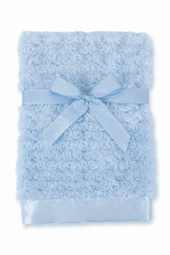 This high-quality blanket from Bearington Baby measures 16" square. The front features a unbelievably soft swirly fabric with satin trim on the edges. The back is a soft blue satin that matches the trim - what a wonderful baby gift!