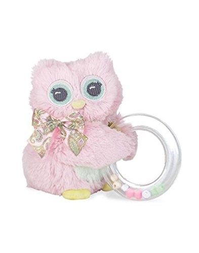 Pink plush owl rattle with pink paisley print satin bow and a shaker ring.;Embroidered eyes to ensure safe use for all ages;5 tall;Approved for ages 0+;Sweet little rattle for your baby from Lil' Hoots collection by Bearington Baby, makes a great gift for a new baby