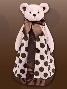 Made from the softest plush this bear is part security blanket part bedtime friend.;The blanket body is made from soft polyester velour with accents of pink and brown polka-dot satin.;This snuggler is 100 percent super soft polyester;Machine wash & dry;This gorgeous 15 Snuggler is perfect for a new baby