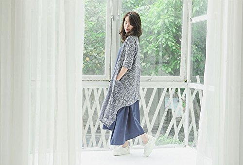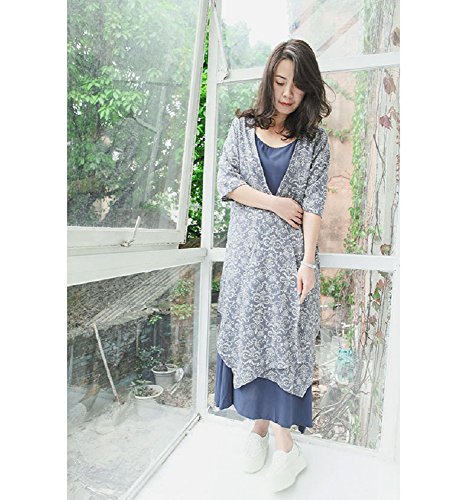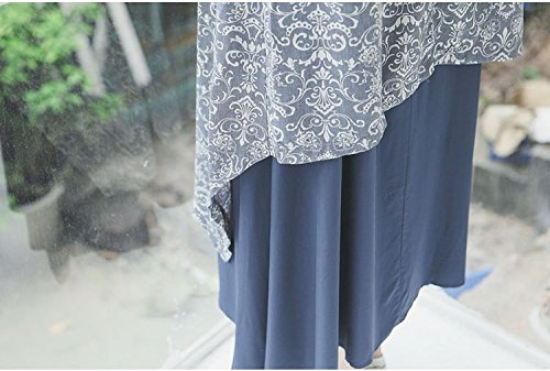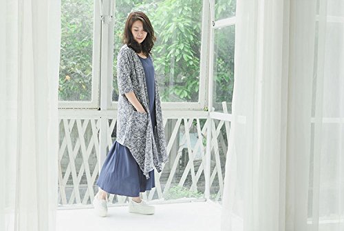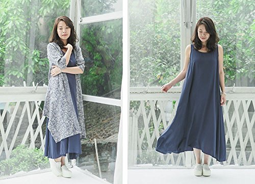女性サマードレスチュニック2ピースセットノースリーブロングドレス+ショールコート ファッションヴィンテージ花柄プリント カジュアルなレジャールースロングドレス 通気性の柔らかい作業 外に出る服 (ブルー)