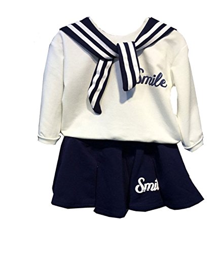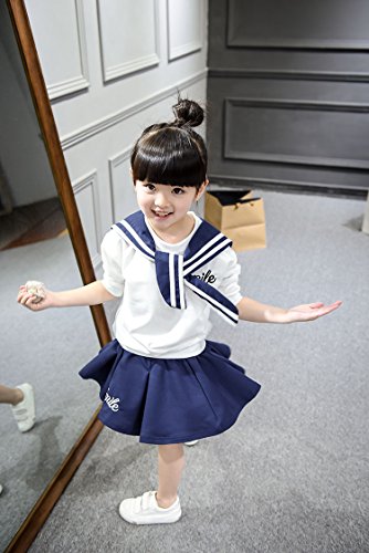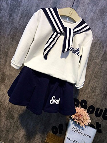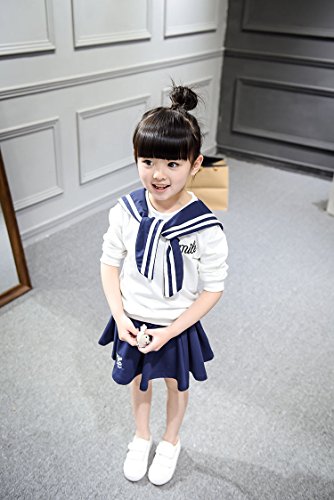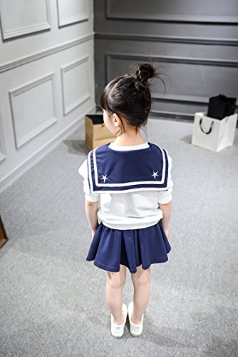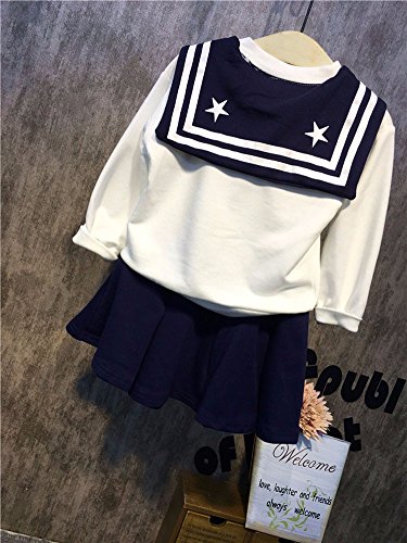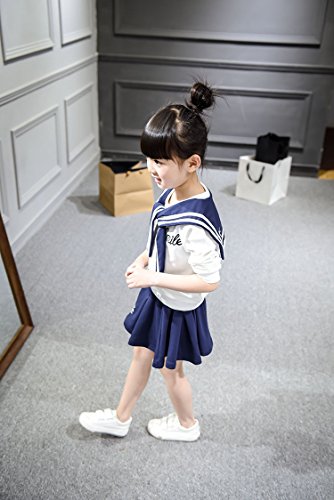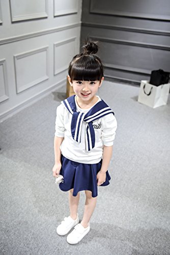 3-7歳の子供の女の子の春の秋の服セット 長袖ネクタイネクタイプルオーバートップス+スカート 子供用スーツケースネイビーセット 女子スクール制服セーラーネイビースーツ かわいいファッションスポーツスーツ (高さ:90〜100cm)