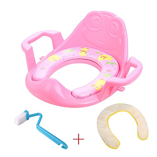 ベビー便座 カバー かわいい カエル おまる便座 BABY 補助便座 抗菌 吸着 暖かく 柔らか クッション U型 補助べんざシート 取っ手付き補助便座 ブラシ付き (ピンク)