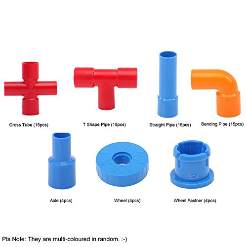 - 「72ピースセット」:クロスパイプ(15)+T型パイプ(15)+ストレートなパイプ(15)+曲がったパイプ(15)+軸(4)+車輪(4)+車輪用固定部品(4)
