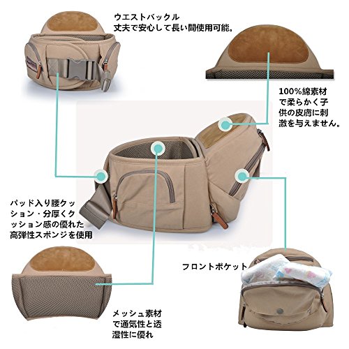 - ヒップシートに自然にお座りした状態でベビーの足が自由に動くのでO脚の予防にもつながる。お尻に当たる部分には高弾力クッションを使って、座り心地は柔らか。滑り止め付きで、体のズレも防止する。