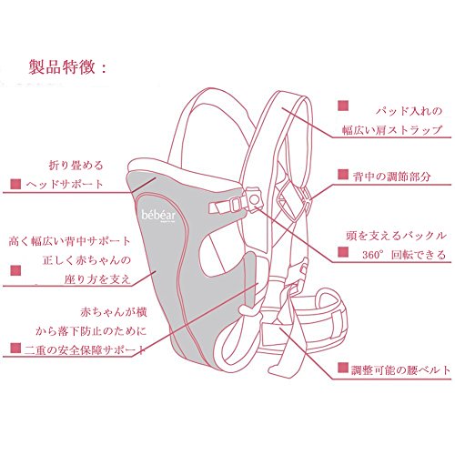 - 生地:100%ポリエステル。通気性が抜群で丈夫。 使用方法:おんぶ、前向き抱っこ、対面抱っこという3つ。