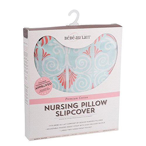 The Bebe au Lait Premium Cotton Nursing Pillow Slipcover makes it easy to stay stylish while breastfeeding. This slipcover features a convenient two-sided front pocket that's perfect for storing burp cloths, breast pads, and other breastfeeding essentials. The cover also features an adjustable padded waist strap with an easy release buckle that tucks away into the side pocket when not in use. The cotton material is machine washable, so the pillow will always be clean and ready for use. Just use, remove, wash, and repeat! Alexandria combines fresh and classic styles with swirls of aqua blue and coral to brighten your day. The Bebe au Lait Premium Cotton Nursing Pillow Slipcover fits the Bebe au Lait Simple Nursing Pillow or the Premium Cotton Nursing Pillow (sold separately). Bebe au Lait is committed to creating products that families love, whether it???s for bath time, mealtime, or on the go. All Bebe au Lait products are made of the highest quality materials and tested to meet international safety standards. Designed by parents for parents, Bebe au Lait is the practical and luxurious choice that mom???s reach for first.