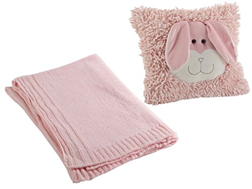 Enjoy two items in one package: Set includes one 30 x 40 inch Nursery Blanket and one 12 inch square Shaggy Pillow with Rebecca Rabbit face as part of the pillow.;Baby and toddler will enjoy playing with the shaggy pillow and floppy ears of Rebecca Rabbit. Simply turn over the pillow for soothing velour side perfect for napping.;Baby will enjoy tummy time on the soft gentle knit blanket. Blanket is large enough to cover for sleep on the floor, playpen or crib.;You won't forget baby's favorite blankie and pillow when baby needs a little soothing at nap time or riding in a car seat or stroller. Soft fabric provides comfort when rubbed and pillow provide interactive play. Baby is certain to squeal in delight with their new friendly animal pillow.;Both blanket and pillow are child safe and suitable for newborn. Features are embroidered and eyes are securely attached.
