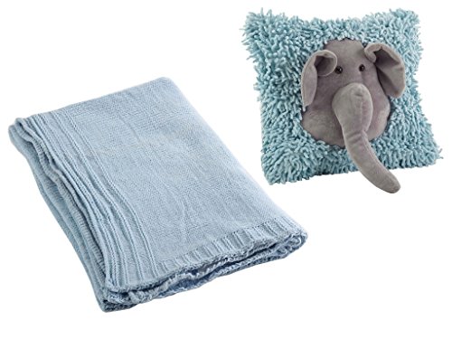 Enjoy two items in one package: Set includes one 30 x 40 inch Nursery Blanket and one 12 inch square Shaggy Pillow with Elwin Elephant face as part of the pillow.;Baby and toddler will enjoy playing with the shaggy pillow and floppy ears and nose of Elwin Elephant. Simply turn over the pillow for soothing velour side perfect for napping.;Baby will enjoy tummy time on the soft gentle knit blanket. Blanket is large enough to cover for sleep on the floor, playpen or crib.;You won't forget baby's favorite blankie and pillow when baby needs a little soothing at nap time or riding in a car seat or stroller. Soft fabric provides comfort when rubbed and pillow provide interactive play. Baby is certain to squeal in delight with their new friendly animal pillow.;Both blanket and pillow are child safe and suitable for newborn. Features are embroidered and eyes are securely attached.