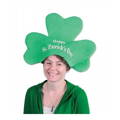 Plush St Patrick's Day Shamrock Hat. This large green shamrock hat is made of fabric and has 'Happy St. Patrick's Day' printed in white. It is one size fits most.