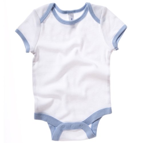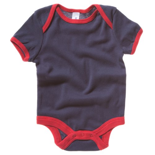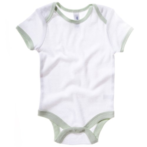 ベビー用半袖リブロンパース。コントラストカラーのトリミング。エンベロープネック。3つのスナップボタン付き。肌触り柔らか。最小限の洗濯縮み。素材:リング精紡機で作られた綿100%。サイズ:3-6ヶ月、6ヶ月-1歳、1歳-1歳半、1歳半-2歳。