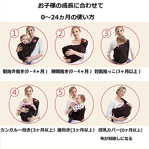- 6WAY:お子様の成長に合わせて(前向き抱き+睡眠抱き+対面抱っこ+カンガルー抱き+腰抱き+授乳カバー)もの使い方ができる新生児用ベビースリングです