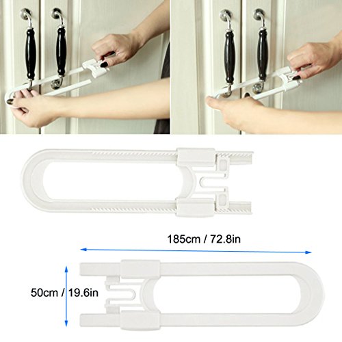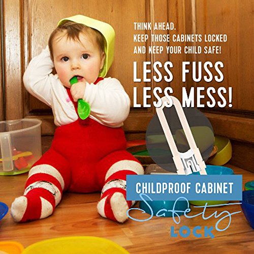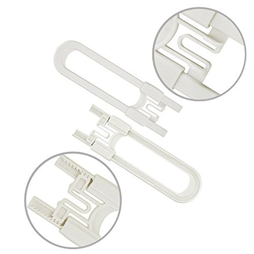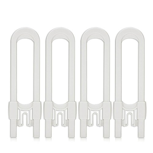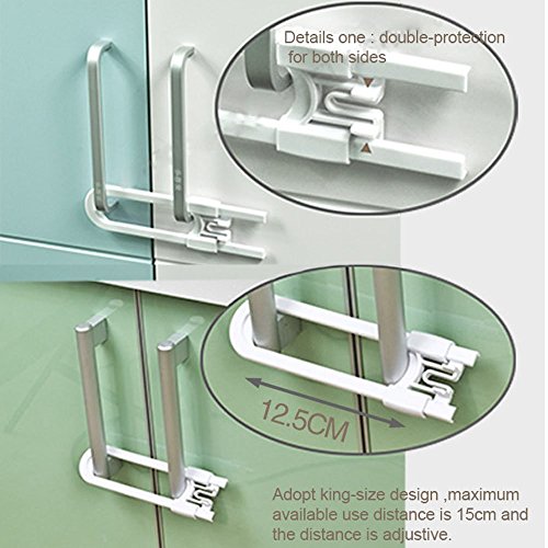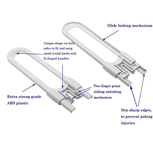 Top grade non-toxic ABS material, resulting in a very durable solution. With none sharp edges, making it much safe for everyone in your family.;The easy to use four-piece lock snaps into a secure position with a smooth gliding , very convenient and flexible.;Maximum distance that can be covered between handles or knobs is up to 12.5cm/4.9in, fits your furniture well.;Long adjustable U shaped design, perfect to block your multiple cabinet doors from your child. Simply hold down the top and bottom at the same time for fast opening, but difficult for young children to learn how to open.;Really easy to use and install, you just have to adjust the U lock to the handles or knobs and tight it to lock your cabinet. Secure cabinet doors easily and quickly without drilling, helping keep curious little ones out of the cabinets.