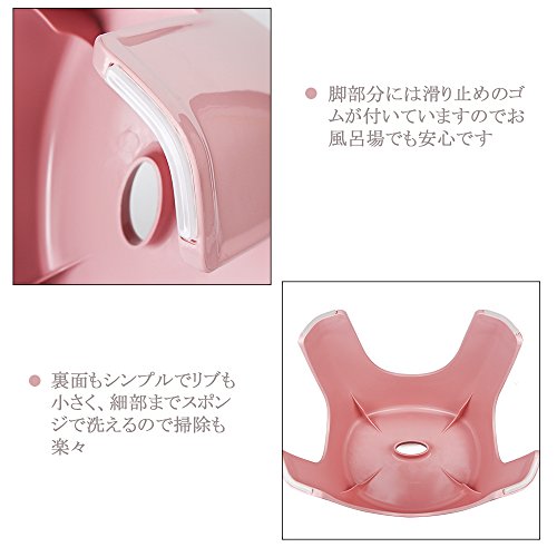 おしりにやさしい柔らかい素材のクッションマットはソフトな座り心地<br> 4本脚で通気性が良く、狭い浴室でも使えるコンパクトサイズ<br> 抗菌加工でお風呂場でも安心<br> 本体は凹凸が少なく、お掃除簡単、お手入れしやすい形状 通気性が良い形状なのでカビが生えにくく、お手入れ、お掃除が簡単、安定して座れる座面形状、背もたれ<br> 脚部すべり止め付、軽いデザインで携帯便利、とても実用一品<br>