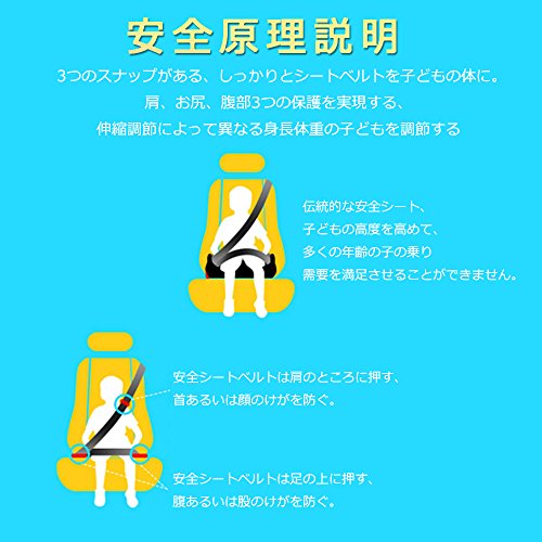 安全原理説明:3つのスナップがある、しっかりとシートベルトを子どもの体に。肩、お尻、腹部3つの保護を実現する、伸縮調節によって異なる身長体重の子どもを調節する。