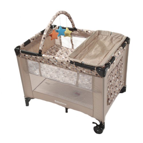 Removable full size bassinet.;Flip away changing table.;Easy compact fold, travel bag.;Two large wheels for easy maneuverability with brakes.;Removable toy bar with three adorable toys.
