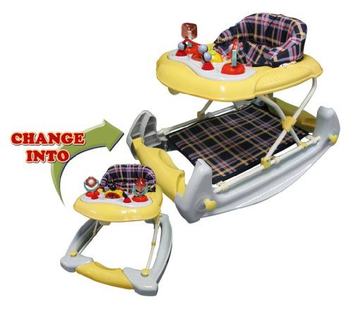 Double function of rocker & walker, easy to change in less than a minute.;Adjust the seat to baby's perfect needs, with safety buttons.;High back seat provide extra support for baby.;Foldable base can fold flat for easy storage and travel;Soft seat for baby protection, can be removed and washed.