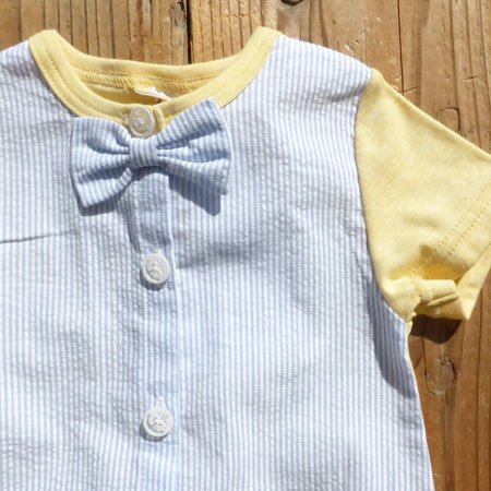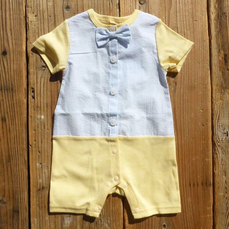 ストライプ切替やチョウタイデザインが、かわいいロンパース