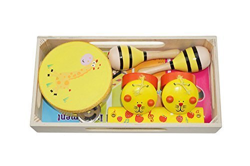 Package contains 4 wood instrument, maraca, harmonica, tambourine and castanets