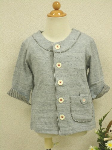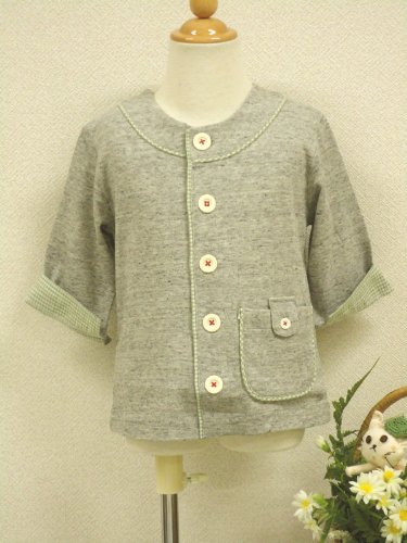 7分袖のカーディガンです。袖口を折り上げると5分袖になり、チェックがちらりと見えます。夏~秋の体温調節に便利な1枚です。
