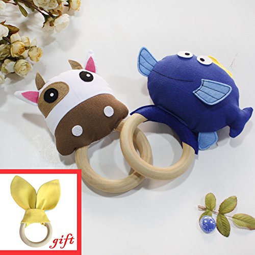 2PCS、[ハッピー牛とブルーフィッシュ]ベビーギフト、木製のリングのおもちゃ