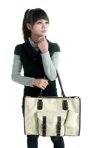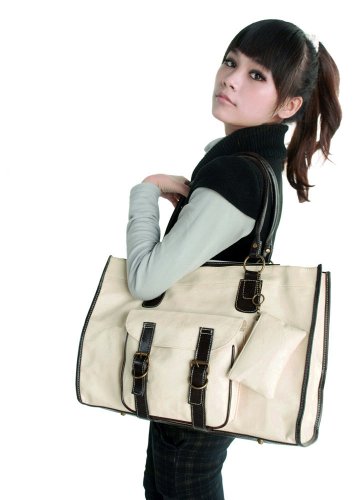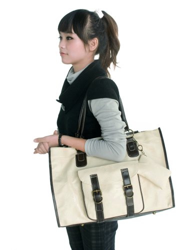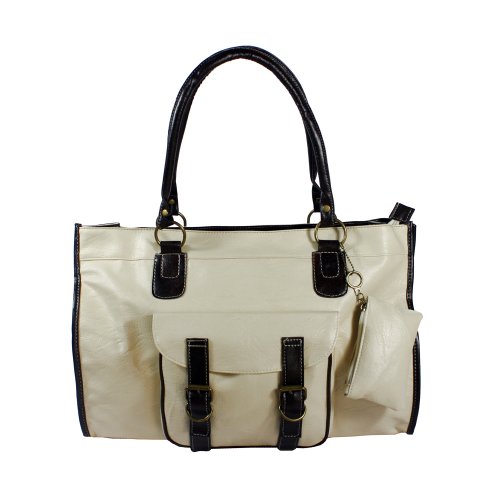 オフホワイト 双ハンドル フロントポケット付きの人工皮革バッグ/ハンドバッグ