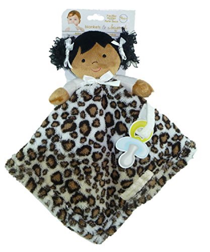Super soft & adorable plush nunu security blanket;Cute doll has black hair with ivory bows;Leopard print blanket measures approximately 16 x 16;Attached soft pacifier holder has velcro closure for easy open-close;100% polyester