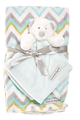 Super soft plush Blanket with a Blue, Grey, Yellow and White Chevron Print;Teddy Bear Nunu security blanket has grey embroidered Nose, Eyes and Ears;Set is wrapped with a grey satin ribbon;Blanket measures 28 x 32. Nunu measures 15 x 15;100% Plush polyester. Machine wash.