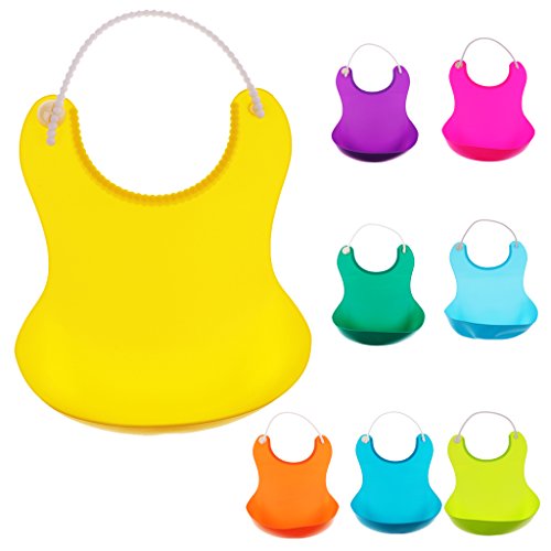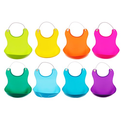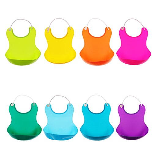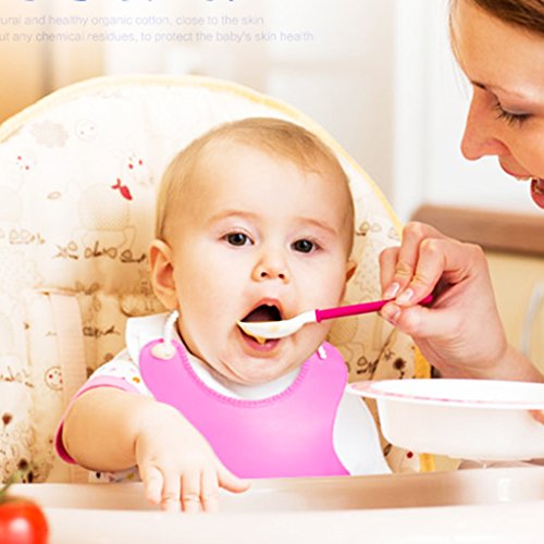 - 広いビブは赤ちゃんの衣服を保護します。深いポケットは食べ物を拾い、飲み物を飲むために使います。