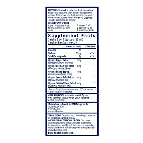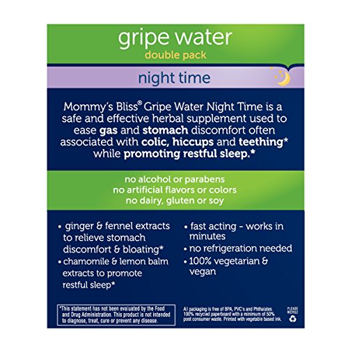 Mommy 's Blissオリジナルグライプウォーター及びMommy 's Blissグライプウォーターは、ガスがたまったり、胃の不快感が伴う疝痛、しゃっくり、歯ぐずりに効果のある、すべて安全で効果的なナチュラルハーブサプリメントです。小児科医推奨。効き目が早く、すべて天然素材を使用。冷蔵不要。アルコール、化学薬品、パラベン、人工甘味料、人工着色料、乳製品、グルテンや大豆不使用。100%ベジタリアン、ビーガン。4オンスボトル。