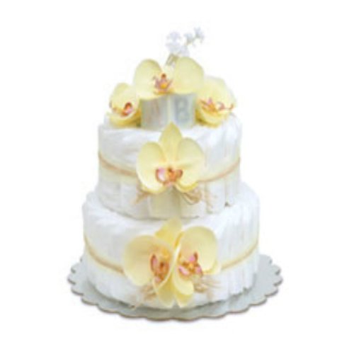 Each tier of the baby diaper cake is tied using light yellow tulle and a layer of natural raffia and adorned with tropical yellow orchids.;2-tier: 12x12x12, 40 diapers;Bloomers Baby Diaper Cakes come wrapped in white tulle, tied with a satin bow and secured with an old-fashioned diaper pin.;Luvs Stage 1 diapers up to 14 lbs.;Note: Flowers subject to slight variations.