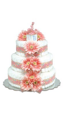 Each tier of the baby diaper cake is tied with jacquard ribbon patterned with pink and pale yellow paisley and adorned with gorgeous pink daisies;2-tier: 12x12x12, 40 diapers;Bloomers Baby Diaper Cakes come wrapped in white tulle, tied with a satin bow and secured with an old fashioned diaper pin.;Luvs Stage 1 diapers up to 14 lbs. Flowers subject to slight variations.;All of our diaper cakes are custom made especially for you upon order. Please allow 1 to 2 weeks to arrive.