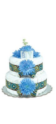 Each tier of the baby diaper cake is tied with jacquard ribbon patterned with blue and pistachio swirls on a chocolate background and decorated with bright blue mums.;2-tier: 12x12x12, 40 diapers;Bloomers Baby Diaper Cakes come wrapped in white tulle, tied with a satin bow and secured with an old fashioned diaper pin.;Luvs Stage 1 diapers up to 14 lbs. Flowers subject to slight variations.;All of our diaper cakes are custom made especially for you upon order. Please allow 1 to 2 weeks to arrive.