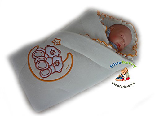 BlueberryShop Embroidered Velour Swaddle Wrap Blanket Sleeping Bag for Newborn, baby shower GIFT 100% Cotton, 0-3m ( 0-3m ) ( 78 x 78 cm ) Cream