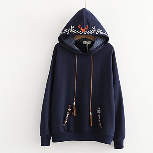 (ボラ-キキ) Bole-kk パーカー プルオーバー レディース 長袖 チュニック シャツ トレーナー スウェット フード付き ゆったり かわいい 刺繍 (ネイビー)