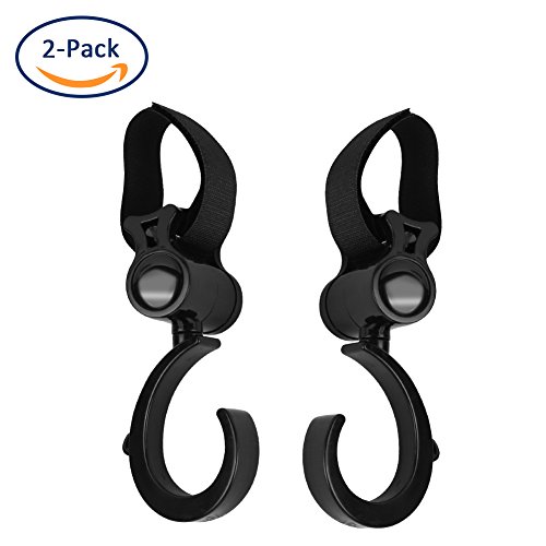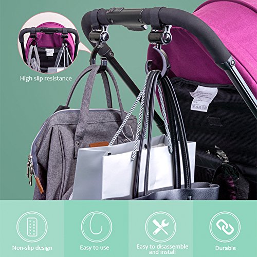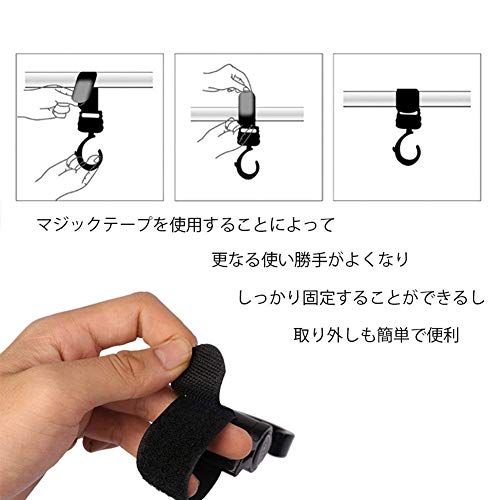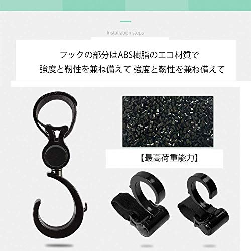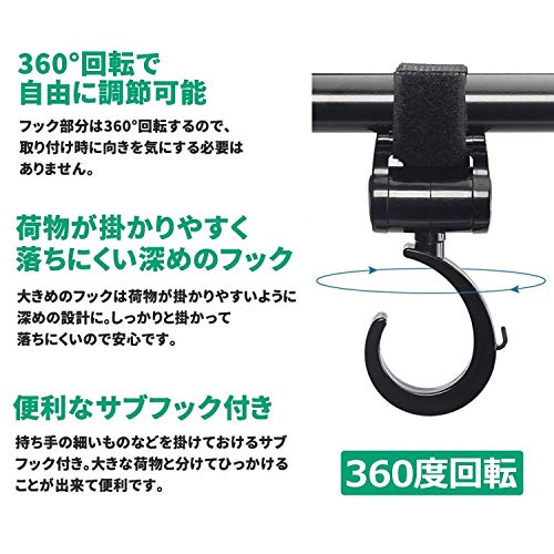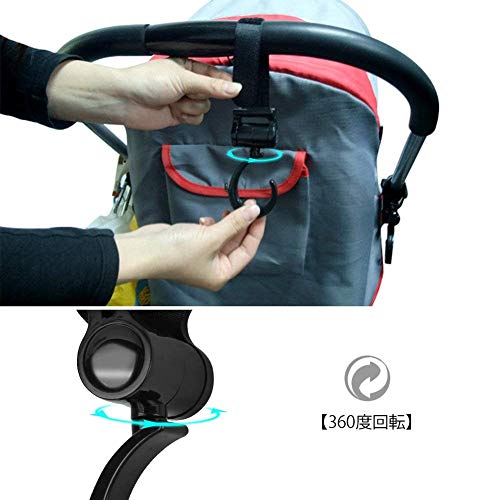 - 「360度回転」:フック部分が360度回転できるので、どんな角度からも簡単にバッグをかけることができます。また、敏活な回転可能のフックで掛けられた物体がベビーカー使用中、バランスを維持することができます。