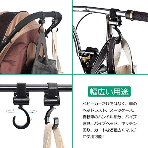ベビーカーフック マルチフック 自転車ハンドルフック 荷物フック 360度回転 マジックテープ式 ベビーカー固定 多機能 【荷重なんと20Kg】 2個セット