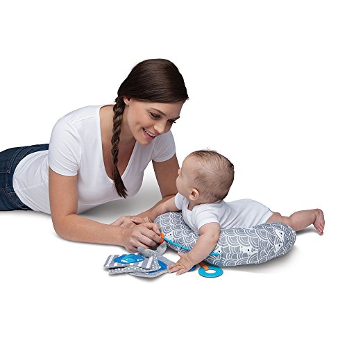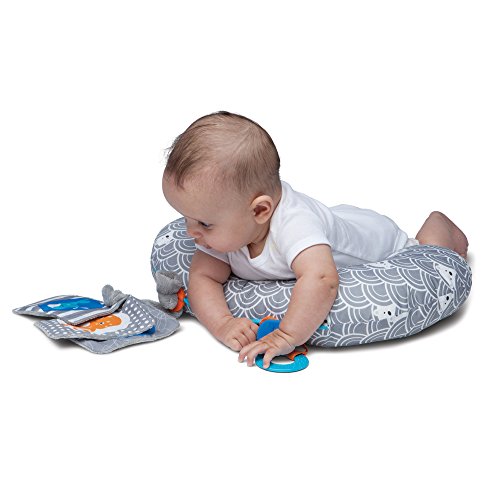 Mini Boppy pillow used for tummy time;With patented Sideline ring toy attachment system;Supports pediatrician recommended tummy time;Removable toys included