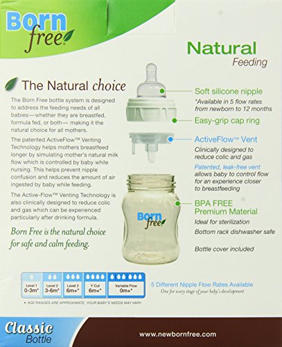 ActiveFlow Venting Technology - Patented, Leak-Free Vent SystemBPA Free Born Free is the Natural Choice for Safe and Calm FeedingBottle Cover IncludedClinically Designed to Reduce Colic and GasHassle Free - Fewer Parts to Clean and MaintainLets Baby Control Milk Flow for an Experience Closer to BreastfeedingNatural Feeding that's Naturally SafePremium Material - Ideal for Boiling & Steam SterilizationThe Ideal Bottle System for Both Breastfeeding and Formula Feeding