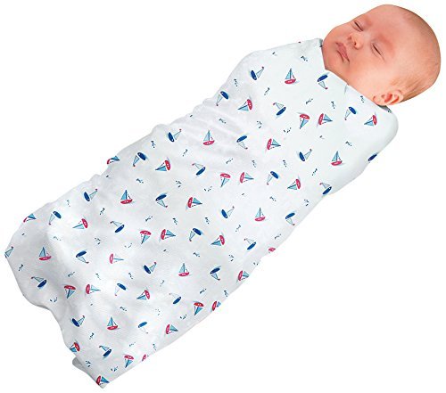 Safe from birth to 3 months;Draws moisture away keeping baby comfortable;Helps regulate temperature and prevent babies from overheating;Provides extra leg room for comfort;package contains 1 printed swaddle and 1 blue dotted swaddle