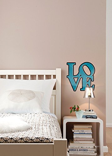 This Love Wall Decal is an adorable way to add charm to any home. A new and creative way on a simple feeling this applique features the words in a gentle blue with swirling accents. This applique comes on a 19" x 27" sheet.