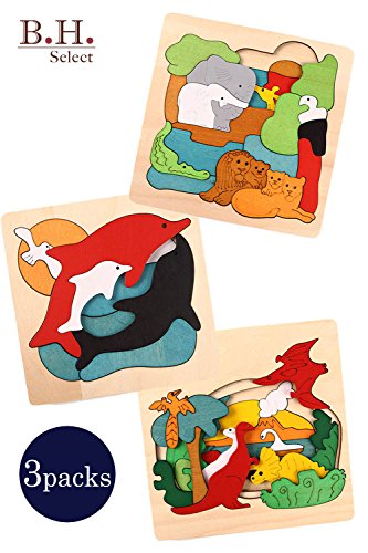 B.H. Select 木製多層パズル 知育玩具 幼児向け (Dセット:イルカ+恐竜+アフリカ)
