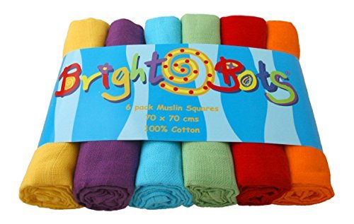 6 Pack 100% Cotton quality 70cms Muslin Squares;Machine washable;Yellow, Purple, Turquoise, Light Green, Red and Orange;Muslin Sqaures have many uses - as newborn nappies, burp cloth, newborn swaddle, general mopping up cloth;Pefect as a new baby gift or for a baby shower