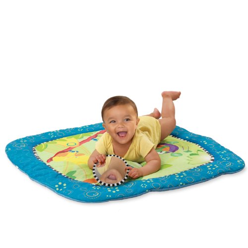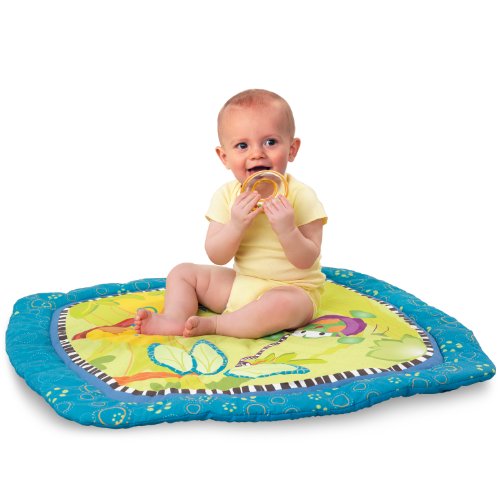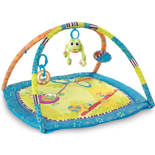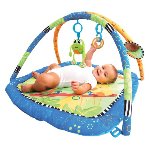 新鮮な配色とかわいいデザインです。 ・3種類のおもちゃがついたプレイジムです。 ・コミカルなキャラクターたちが描かれたマットは、肌ざわりよく、寝心地がとても良いです。 かえるの形をしたぬいぐるみをふると、鈴の心地よい音が鳴ります。 ・カラフルなビーズラトル、赤ちゃんの大好きなミラーもついて、楽しく遊ぶことができます。 ・バー部分には、付属のおもちゃを取り付けられるループが5ヶ所付いています。 ・お気に入りのおもちゃをジムやベビーカーなどに取り付けることのできるファンリンクが4個付いています。 [商品スペック] ●商品サイズ(cm/g) : W76×D76×H43/560g ●パッケージサイズ(cm/g) : W59×D6.5×H59/1040g ●製造国 : 中国 ●企画・デザイン : アメリカ ●材質・素材・成分 : ABS/PP/PET/PE/ポリエステル ●安全基準 : CE、食品衛生法 ●対象年齢 : 0ヶ月~ ●備考 : 電池交換不可